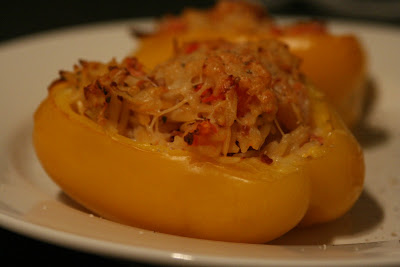 This evening I made stuffed peppers for dinner. I stuffed them with orzo, bacon, goat cheese, tomato, garlic, parsley, and shrimp. I topped them with Parmesan.